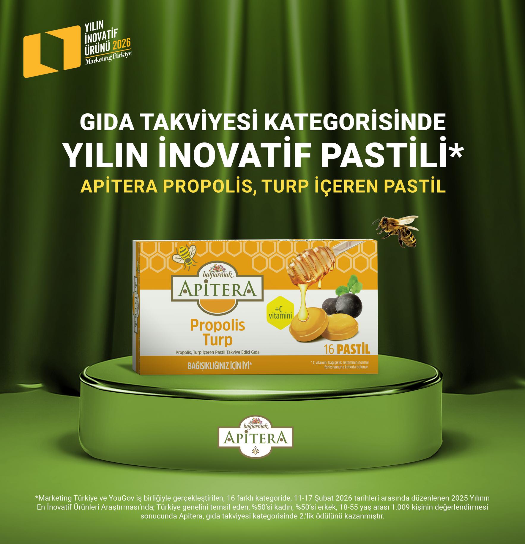 Balparmak’ın iyi yaşam markası Apitera’nın doğal bal, propolis ve turp içeren pastili, Marketing Türkiye ve YouGov iş birliğiyle gerçekleştirilen “Yılın İnovatif Ürünleri” araştırmasında gıda takviyeleri kategorisinde “Yılın İnovatif Pastili” seçildi. Gelenekselden ilham alan yaklaşımını modern ve erişilebilir bir forma taşıyan ürün, tüketici beklentilerine uygun yenilikçi yapısıyla dikkat çekti.
