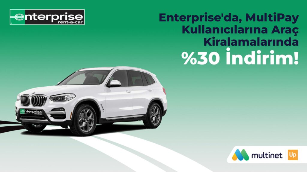 Multinet Up, mobil cüzdan uygulaması MultiPay üzerinden sunduğu kampanyalar kapsamında dünyanın lider mobilite şirketi Enterprise Rent-A-Car ile yeni bir iş birliğine gitti. Bu sayede MultiPay kullanıcıları, Enterprise’ın online araç kiralama hizmetlerinde liste fiyatı üzerinden yüzde 30 indirimden yararlanabiliyor.